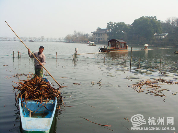 清晨,西湖,西泠桥,苏小小墓以西,镜湖厅以东,新新饭店公交站对面的北里湖面,显得格外安静。环卫工人每天都划船会经过这里,清理西湖里的残荷。