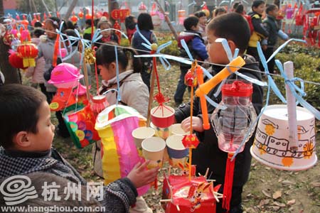 原来寒假里,小朋友们都有一个特殊的寒假作业,就是用废旧材料亲手制作一个灯笼。小灯笼造型各异,材料也是五花八门。一次性纸杯、饼干桶、塑料罐、旧光盘等废旧材料通通变废为宝了。看看自己的灯笼,再比比别人的,大家脸上都露出了自豪的笑容。