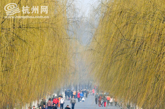 在杭州,春天如果到来,它的脚步先踩到哪呢?必须是西湖。下午到白堤上转了转,发现柳树已经不再那么光秃秃的,有了一层嫩黄的色彩,这是柳树在抽芽。游人明显增多,船老大的生意也明显兴隆了起来,岸边极少有船夫苦于招揽客人,向湖面望去,一艘艘游船浸在落日的余晖里,是该这么享受春天的。