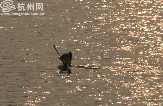 放风筝的大伯手一抖,它的风筝便扎进了金色西湖里(陈少思 摄)