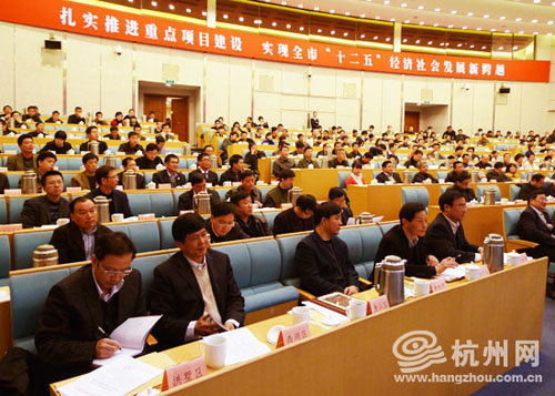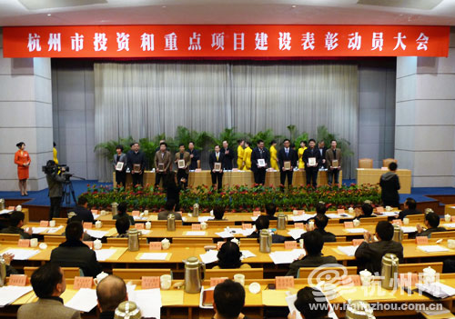 杭州市召开投资与重点项目建设表彰动员大会,黄坤明、邵占维、杨戌标、许勤华、徐祖萼、俞志宏、赵光育等市领导出席会议。