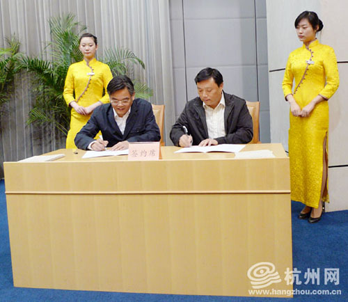 杭州市委副书记、市长邵占维(左)代表市政府与市直有关部门和区、县(市)政府签订目标责任书。
