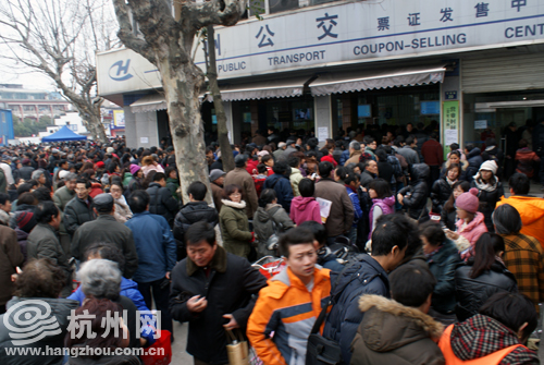 在杭州公交票证发售中心门口摆了多年报摊的王大伯,还从来没见过这么壮观的办卡队伍。