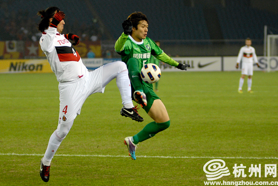 中场占优的绿城队围绕着两个边路持续组织进攻,而被动的名古屋队则只能依靠定位球来还击。第28分钟,名古屋队获得底线附近的任意球,主罚队员低平球开到禁区内,田中斗笠王起脚扫射打高。第32分钟,回撤拿球的拉米雷斯在后场丢球,玉田圭司得球突进后在禁区前射门,被杜威倒地封出。