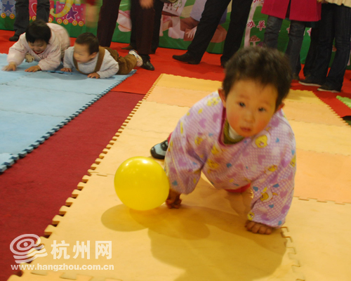 一个个刚满周岁的小宝宝,为了献礼妈妈的节日,努力地扭动着小屁股,使劲地爬行前进着,让人忍俊不禁。