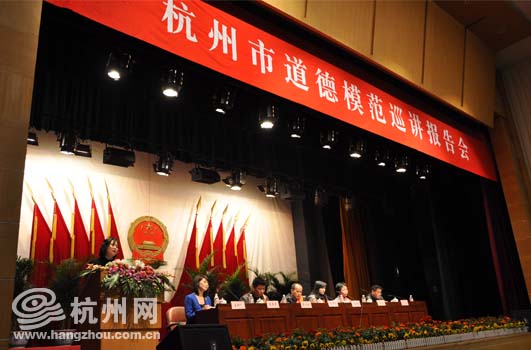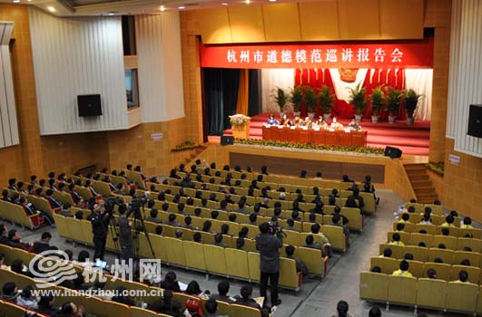 杭州网讯 今天下午,杭州市道德模范巡讲报告会区县市的第一场活动在上城区政府大礼堂举行。虽然离报告会开始还有十五分钟,但是会场里已经坐得满满当当了,听报告的人中有机关干部、学校老师、公安干警、城管执法队员还有来自附近的中小学生以及社区居民。近600人在大礼堂聆听五位道德模范代表的报告,共同感受来自民间的,来自身边的,来自普通人内心的那一份属于道德的感动。