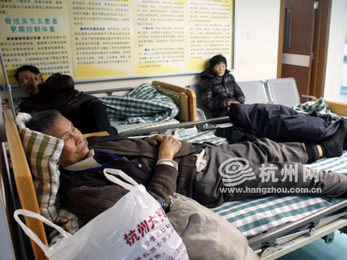 杭州网记者核实报道:今天下午,记者在杭州市中医院住院部9楼大厅见到受伤的大伯。大伯姓赵,今年74岁,躺在大厅的一张病床,不停向前来采访的记者介绍起今天的遭遇。