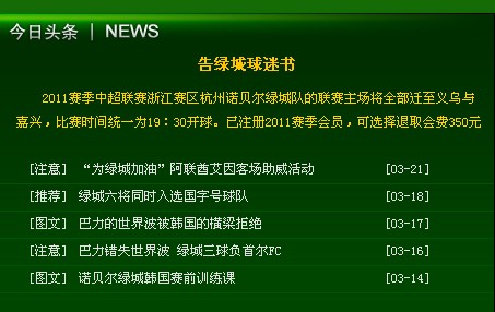 现在,我们不得不遗憾地告知广大球迷朋友:2011 赛季中超联赛浙江赛区杭州诺贝尔绿城队的主场将全部迁至义乌与嘉兴(考虑到义乌和嘉兴的实际情况,基本安排为上半程迁至义乌、下半程迁至嘉兴,具体轮次尚在紧张磋商中,比赛时间统一为19:30开球);同时,俱乐部也欣慰地告知广大球迷朋友:2011年亚冠联赛小组赛的另两场比赛依旧在杭州黄龙体育中心举行,如绿城有幸在亚冠的前进路上走得更远,接下来的主场设定还需要协调;2011赛季足协杯赛杭州诺贝尔绿城队的比赛根据最新赛程,要在11月份才进行,主场待定。