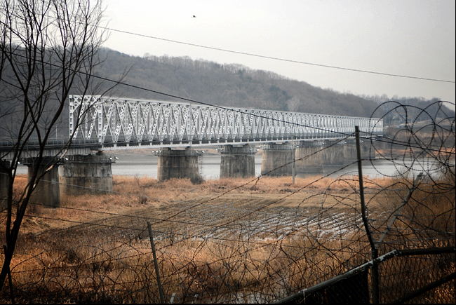 透过铁丝网,对面就是自由桥,再过去点就是朝鲜。这座桥1953年韩战停战协议签署后铺设,长83米。当时12000多名战俘走过这座桥回到了韩国,“自由桥”也因此而得名。