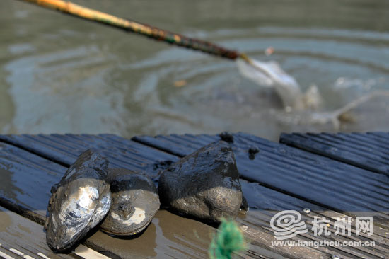 打捞了半天,唯一收获:两只河蚌。