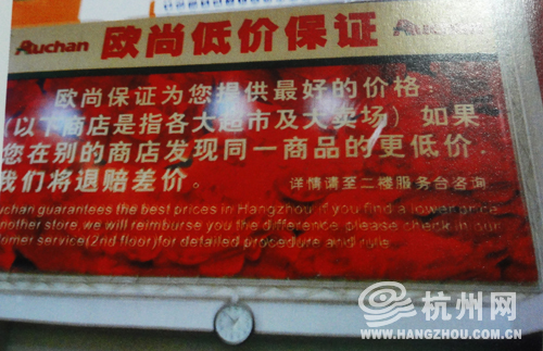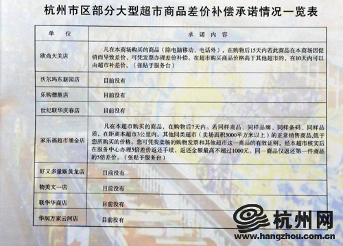 欧尚大关店和家乐福涌金店在服务台有关于差价退赔和补偿的告示张贴,在店内也有相应的承诺告示,在沃尔玛东新园店从营业员处了解到该店主要在购物彩页上有时会有不差价的承诺。