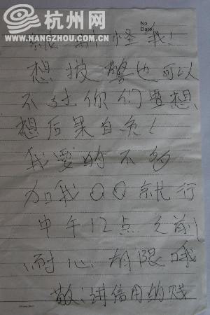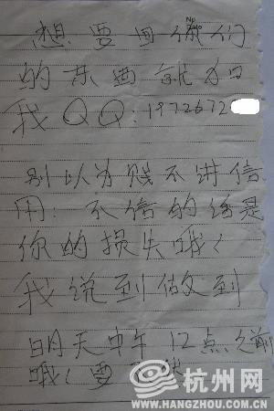 孙女士好奇的捡起来一瞧,上面写着:“想要回你们的东西就加我QQ:*****,别以为我贱(贼)不讲信用:不信的话是你的损失哦!想报警也可以不过你们要后果自负。我要的不多,加我QQ就行,中午12点之前,耐心有限。”