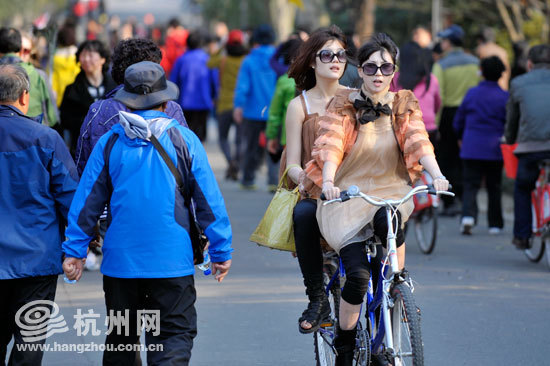 苏堤上游人如织,两位打扮已很“夏天”的姑娘骑着双人车“杀出重围”,长舒一口气(王宁 摄)