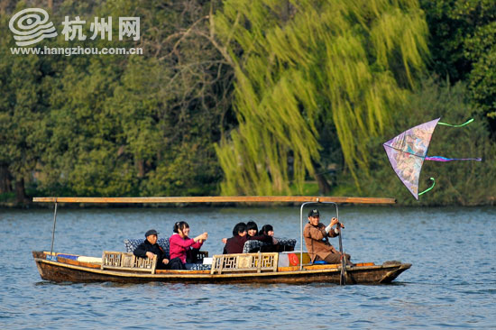 西湖里,一群乘船的游客放起了风筝(王宁 摄)
