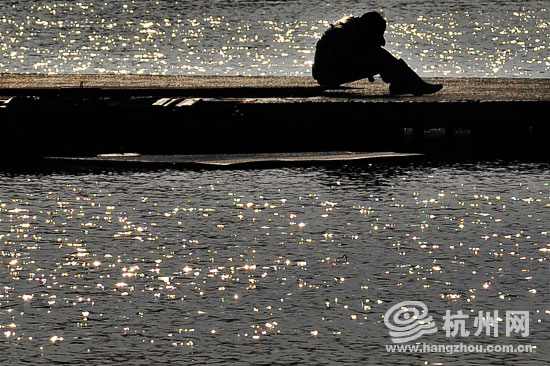 印象西湖的演出平台上,一位工人在一片波光中小憩(王宁 摄)