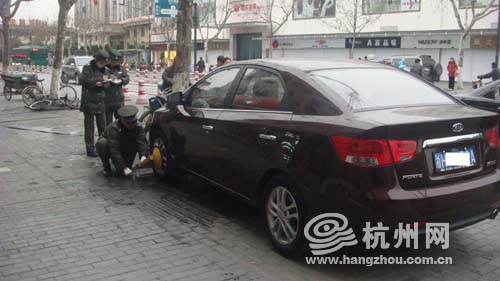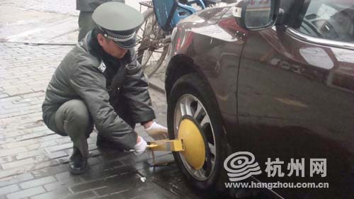 执法队员将车牌号输入“城管通”,核对车辆的违停信息。刚一输入,“城管通”就滴滴滴地叫起来,显示该车有5次违停记录,且都在大关地区。执法队员按规定将车锁住,并贴上了《锁车告知书》。