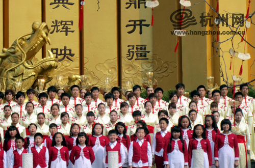 10时25分,恢弘的音乐响起,240名成人合唱队、80名少年儿童组成的合唱队齐声高唱《黄帝颂》,著名歌唱家殷秀梅和童星李木子手牵手,在金色的祈福树下共同领唱。