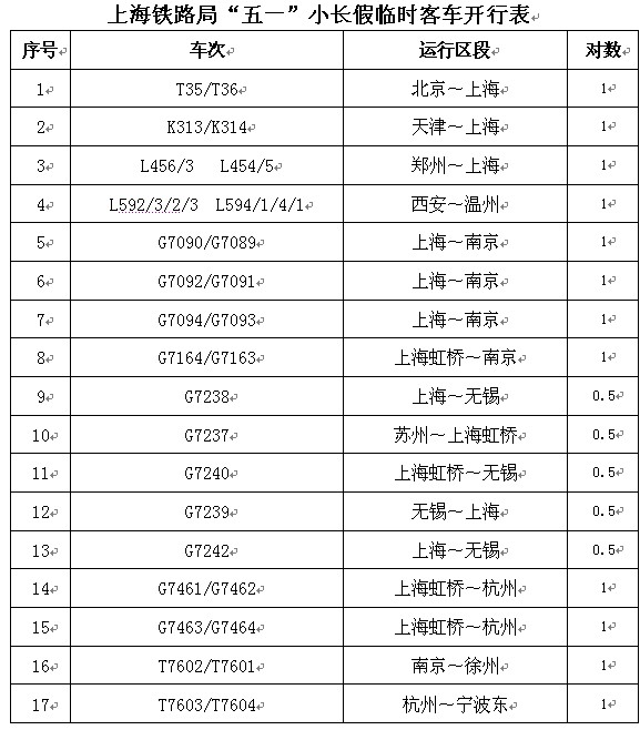 附件:上海铁路局“五一”小长假临时客车开行表
