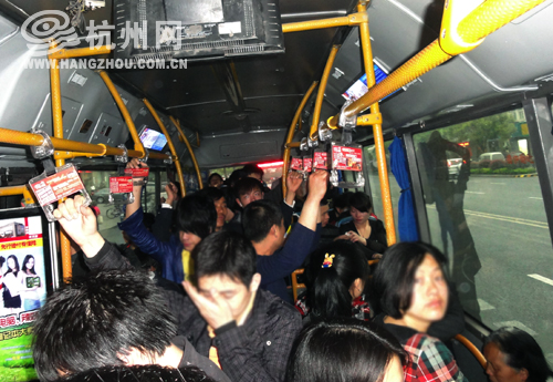 上午9点30分,杭网记者从新时代家具广场上了一辆开往城站火车站的900路公交车,车上的乘客非常多,因下雨天,气压低,加上车厢里的人又多,车窗无法打开,车厢里的空气实在闷的让人难受,车开了三站过后,车上的乘客越来越多,乘客都在抱怨,车厢里又闷又热。