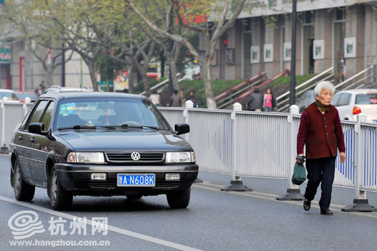 杭州网讯 凤起路上,一位大妈放着好好人行道不走,一个人冲到马路中央,沿着护栏悠哉悠哉,过往车辆只能小心绕开。马路对面有个菜场,大妈手里还拎着一个绿色的布袋,看样子像是去买菜。