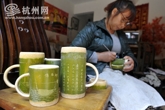 用鲜竹子手工制作的茶杯,据说泡起茶具有清火的功效。