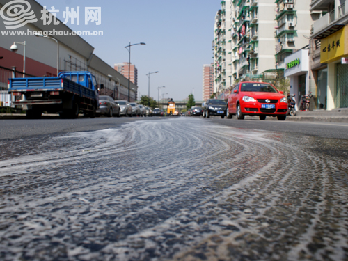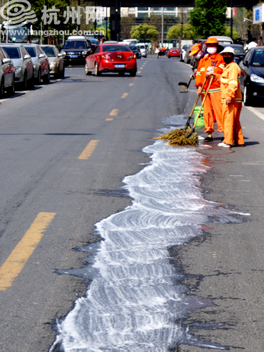 杭州网讯 上午在上塘路欧尚超市旁的上绍路,记者经过时,看到几名清洁员正在对路面进行清洁。记者发现,与以往不同的是,清洁员们只对路面中间特定的部分进行打扫,用洗洁精加上白色的粉末,路面中间出现了几百米的白色带。