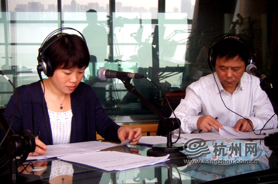杭州市爱卫办副主任、市卫生局爱卫处处长马振兴(右)与杭州市健康办陈珺芳(左)参加直播
