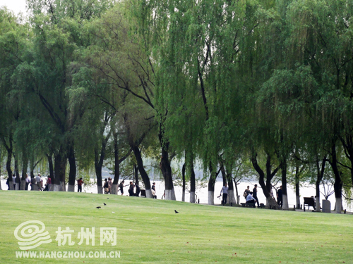 在西湖边柳树下的人们独自享受着绿柳成荫的美景