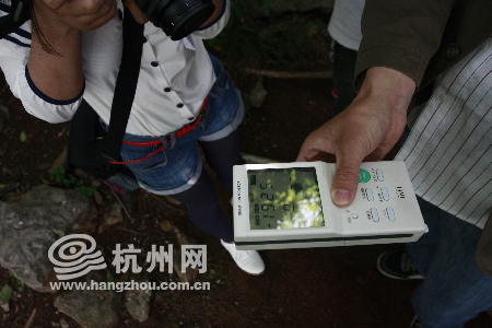 在玉皇山顶,工作人员拿着的一个长方形的白色检测器上,数字不断在刷新。据观测,今天早上9:30分,山顶的负氧离子基本维持在每立方厘米瞬时1500——2000个,已经远远超过了世界卫生组织规定的清新空气的标准(世界卫生组织规定,清新空气的负氧离子标准浓度为每立方厘米空气中不低于1000—1500个)。
