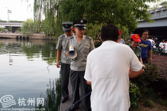 市城管执法局法规科的朱燕介绍,根据《杭州市河道管理条例》发现游泳或垂钓者,先进行劝导,如果劝导无效,将处以50元的罚款。
