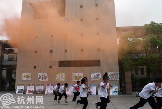 杭州网讯 一阵警报声响起,杭州江南实验学校的正常上课被突然打断,紧接着教学楼内多处地方升起浓烟,全校三千多名师生,分别从教学楼各楼层,迅速地奔向操场。