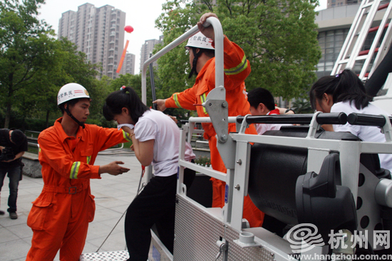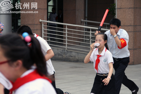这是浙江省“5.12防灾减灾日”校园应急避险演练暨消防安全教育现场会上的一幕。今天,杭州江南实验学校模拟地震发生并引发火灾后应急疏散逃生演练。