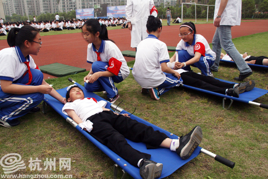“受伤”的学生在操场上被救治