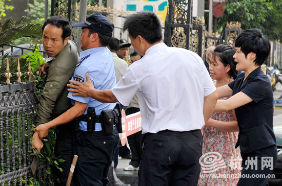 民警与协警合力将持刀男子顶在路旁边的铁栏杆上,在保安的配合下抢下男子手中的菜刀。在抢刀过程中,男子仍不停叫骂。现场气氛十分紧张。随后民警要将持刀男子带离现场,持刀男子不仅反抗,还声称要投诉民警滥用警力。民警向男子严正声明并要求其配合执法,终于将男子控制住并带上警车。