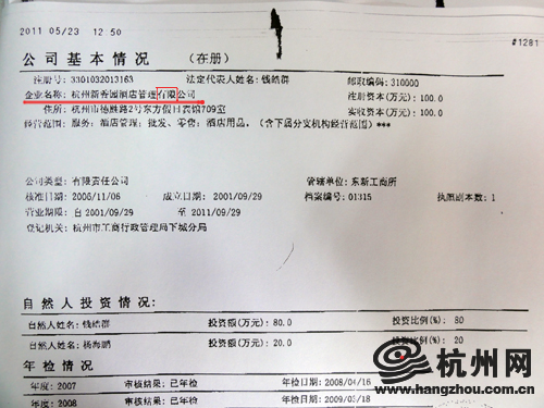 “合同公章是杭州新香园酒店管理公司,而公司的全称是杭州新香园酒店管理有限公司,给我合同盖的公章没有有限两个字,律师也去了杭州工商局查证过,确实没有杭州新香员酒店管理公司,是有限公司。现在是想打官司都没有办法打了。”陈先生说。