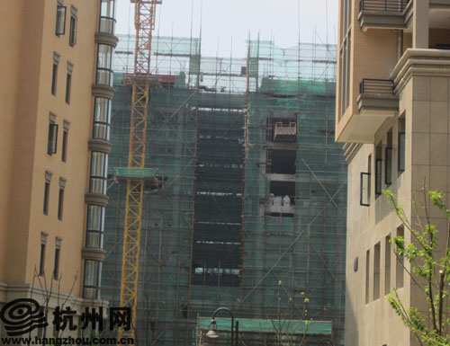 再后来,范先生又发现楼前那块空地在动工盖房子,这同样引起了小区其他业主的注意。很多业主找到了开发商询问,开发商的解释是:“这块地本来就不是我们的,至于他们要盖什么房子我们也不好阻拦。虽然这样的解释让很多业主都无法满意。但你们如果有问题可以去问余杭建设局,所有的盖房审批都要通过那里审批才可以建造。而至于5、6、8栋的楼梯我们是考虑到这几栋房子与其它几栋结构不一样,而下面1到3层又是商铺,在上楼梯的时候得有扇门挡住,楼梯也不怎么使用,所以就用了水泥楼梯。”