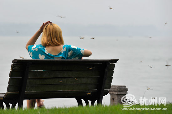 风雨欲来,西湖边的蜻蜓漫天飞舞。(王宁 摄)