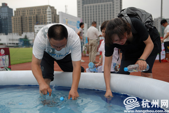 不过对于环保,更多的孩子则乐衷于其游戏本身。在一个“泳池捞塑料瓶”的游戏中,不少孩子见到水就兴奋地跳了进去,边捞瓶子边戏水,一旁的游戏裁判看得是哭笑不得。