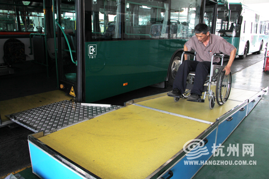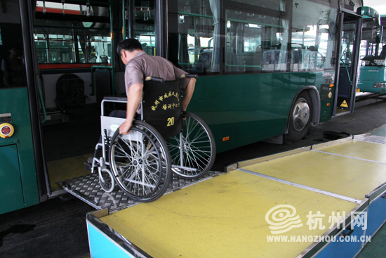 推着轮椅可以很轻松地送无障碍通道进入公交车