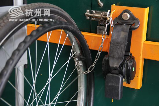 为进一步实现无障碍功能,工作人员还将对车体内部进行改造,原本车厢中部的6个座椅将被拆除,改装成6个供停放轮椅的专用装置,乘客只要用装置上的两根链条分别将轮椅的两个轮子扣住,再扣上安全带,轮椅就被固定住。