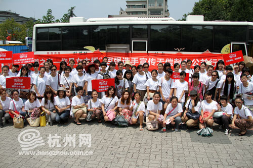 在吴山广场的献血车前,100多名选手合影
