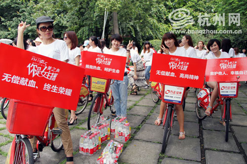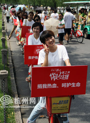 “美之声你是女主播”的百强选手以“准女主播”的身份,在8月9日履行女主播作为无偿献血宣传大使的职责,在杭州的西湖边以骑行的方式向市民、游客宣传无偿献血知识,体验女主播作为公众人物应尽的社会义务。