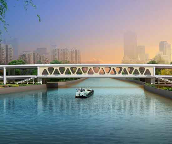 值得一提的是,本次工程设计了“双层复合桁架梁”结构形式,即在运河上采用双层通道,上层为双向8车道的主线高架,下层为双向6车道及非机动车道的地面道路。