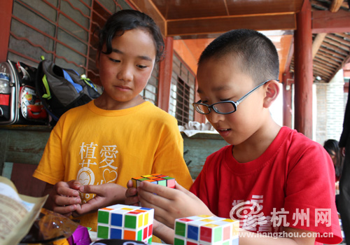 杭州小朋友周宇昊向蜂菊芬讲解如何玩魔方。