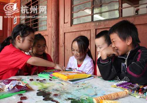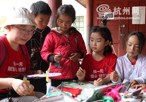 浙江“捐一元•献爱心•送营养”工作人员教孩子们绘制疯狂地小鸟。