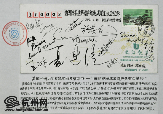 2001年西湖申报世界遗产编制成果汇报会时,谭启晓制作的首日封,上面写满了与会者签名。