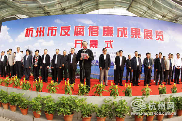 由市委、市政府主办,市纪委、市监察局承办的“杭州市反腐倡廉成果展览”今天上午开幕。省委常委、市委书记黄坤明专门为本次展览题词:“人间正道”,并在开幕式上讲话。