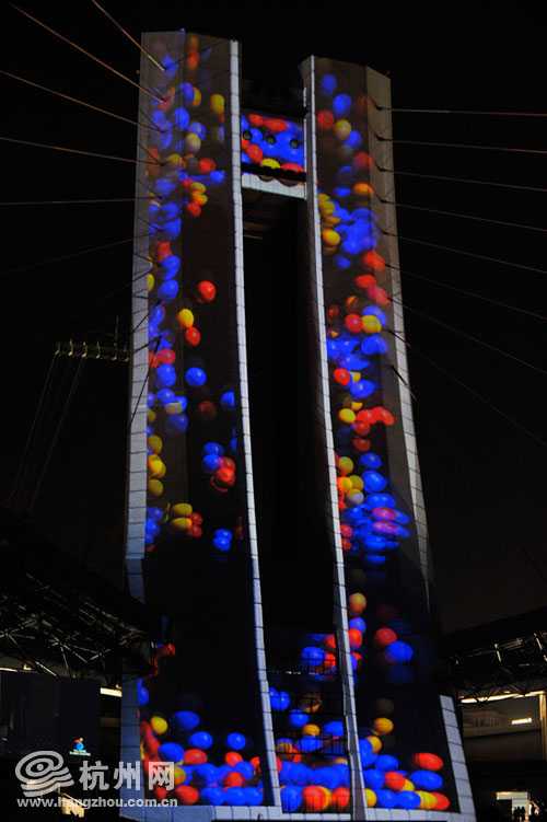 黄龙体育中心的南北双塔还变身华丽的3D灯光秀。