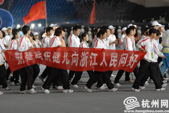 运动员进场仪式,运动员们打出向浙江人民问好的标语。