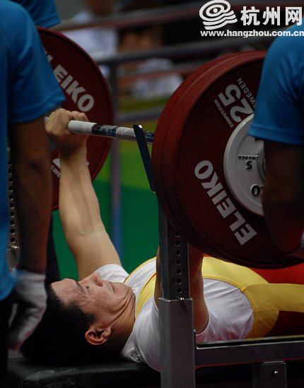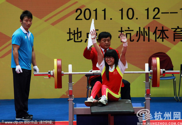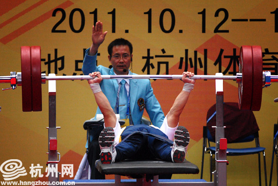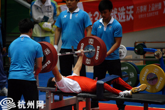 杭州网讯 提起中国的举重运动,相信很多人脑海里浮现的都会是占旭刚在悉尼奥运会上的惊世一举。占旭刚在最后一举时青筋爆出的样子和试举成功后的振臂狂呼成为了中国举重史上最具代表性的一幕。有这么一群人,他们因为肢体的残疾而无法像占旭刚那样站着完成试举,但这依然无法阻挡他们投身到举重运动之中。采用特有的卧式举重,他们同样可以完成力拔山兮气盖世的奋力一举。在残奥会的举重比赛中,张海东、边建欣等运动员也曾和占旭刚一样勇夺冠军,为国争光。10月12日上午,在第八届全国残运会的女子40公斤级举重比赛中,山东姑娘崔哲夺得了第一枚举重金牌,并打破世界纪录,这同时也是本届残运会开幕式之后决出的首枚金牌。